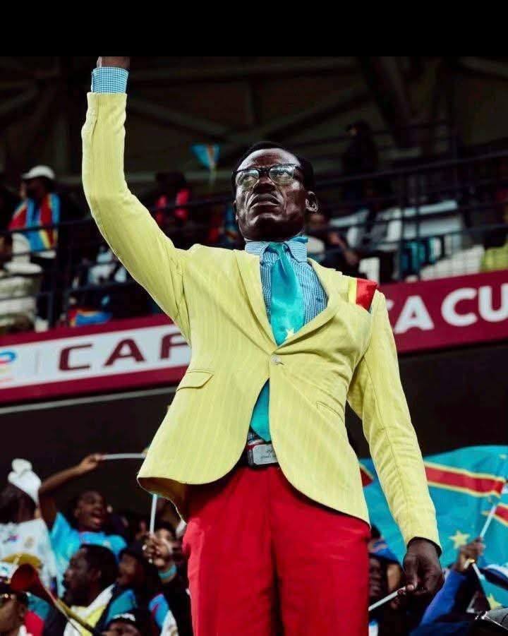 Vêtu d’un costume aux couleurs nationales et le bras droit levé, Michel Kuka reproduit la posture de Patrice Lumumba, symbole de l’indépendance congolaise. Pendant que le stade vibre de chants et de célébrations, lui reste silencieux, concentré, et immobile, offrant un hommage discret mais puissant à l’histoire de son pays.