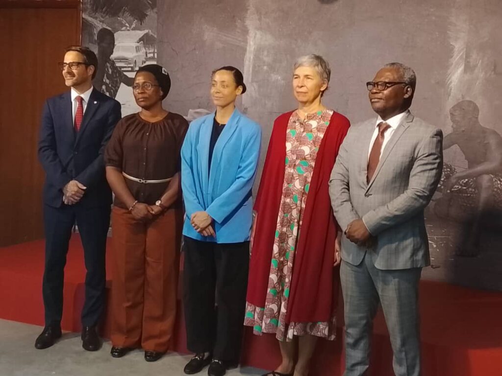 La directrice du projet muséographique, Dr Mchaela Oberhofer( 2e à partir de la gauche), la directrice du MuCAT et la représentante du ministère de la culture étaient encadrées à cette occasion par l’ambassadeur de Suisse en Côte d’Ivoire et le directeur du Musée des Civilisations (à droite ).