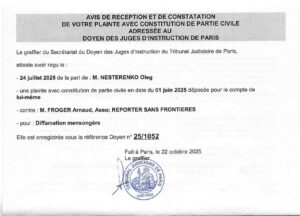 Suite à une campagne de diffamation menée en mai 2025, l’ONG Reporters Sans Frontières (RSF) fait l’objet de poursuites judiciaires pour atteinte à l’honneur de M. Oleg Nesterenko, président du CCIE. Une plainte, accompagnée d’une constitution de partie civile, a été déposée auprès du juge d’instruction du Tribunal judiciaire de Paris, étayée par des preuves matérielles et vérifiables réfutant les allégations émises par l’organisation.